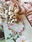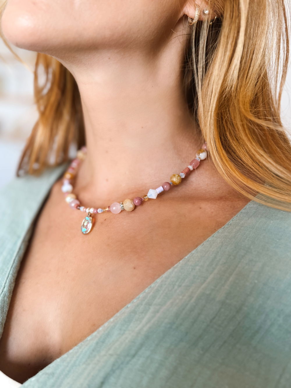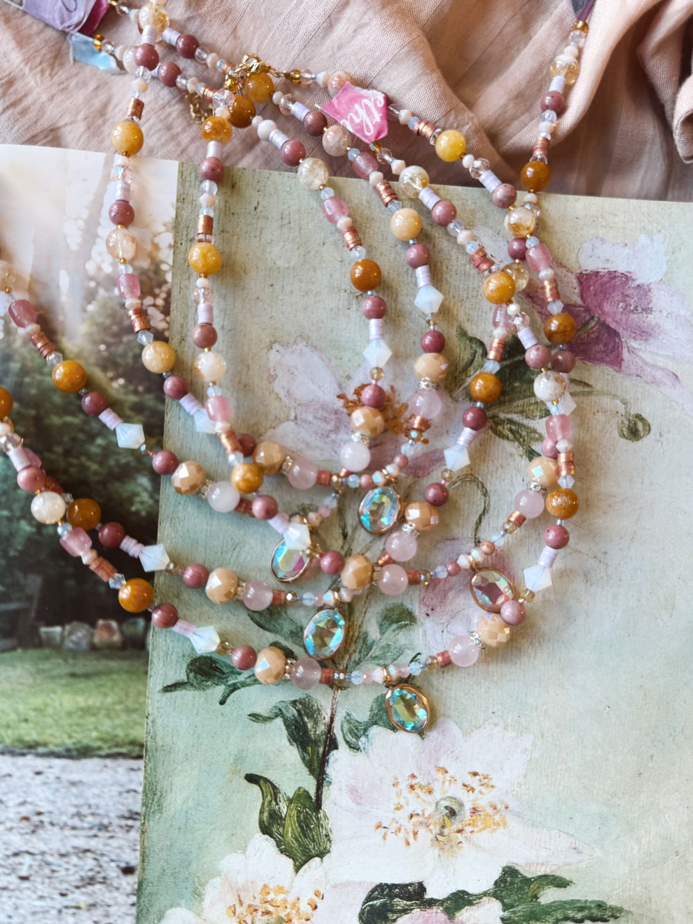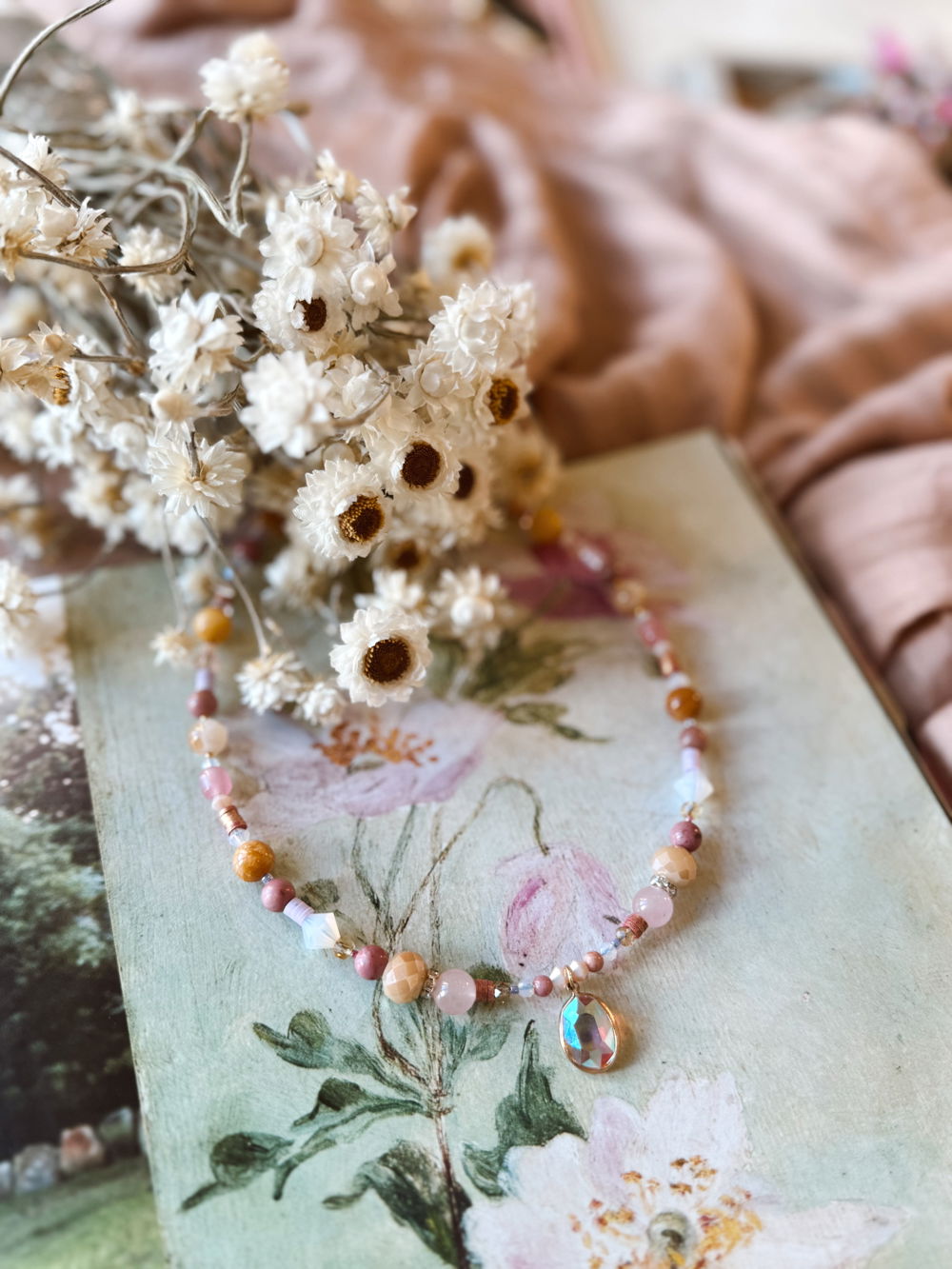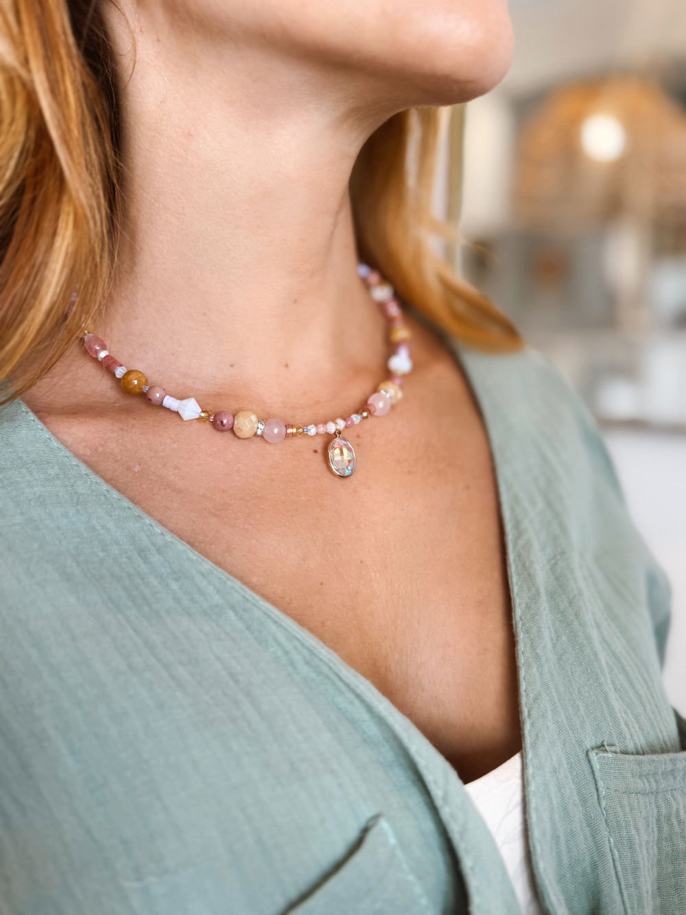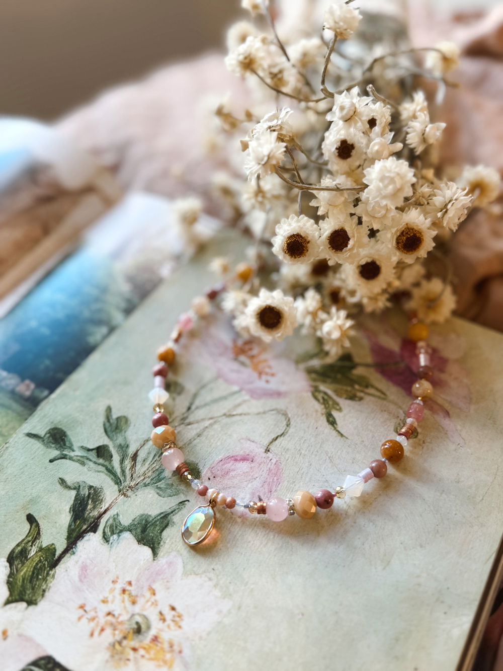 Choker delicado realizado a mano con piedras y cristales en tonos rosados, durazno y dorado que evocan suavidad y calidez.