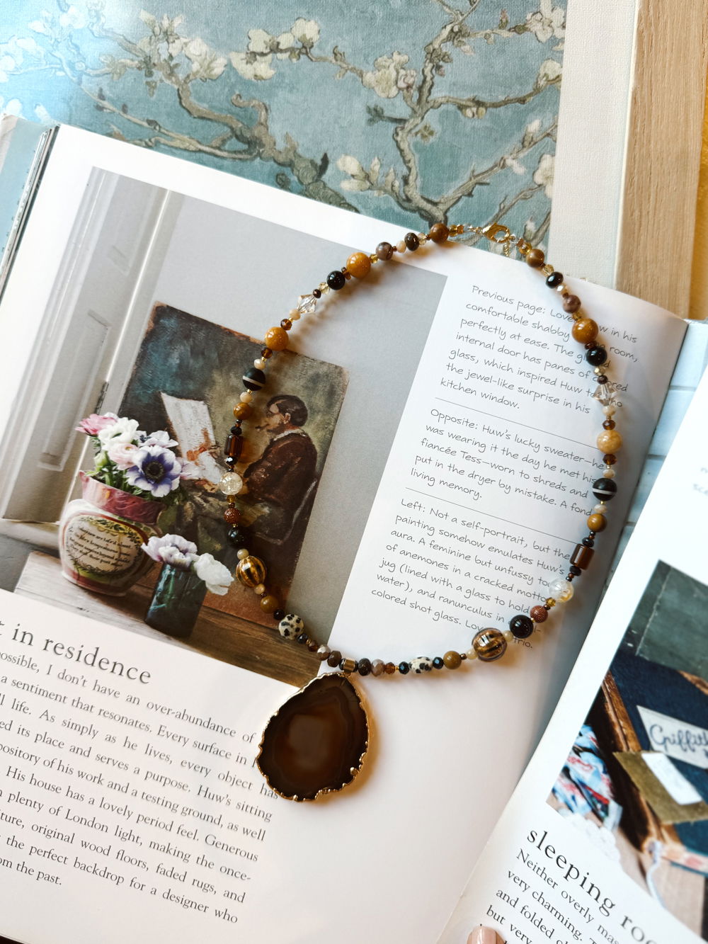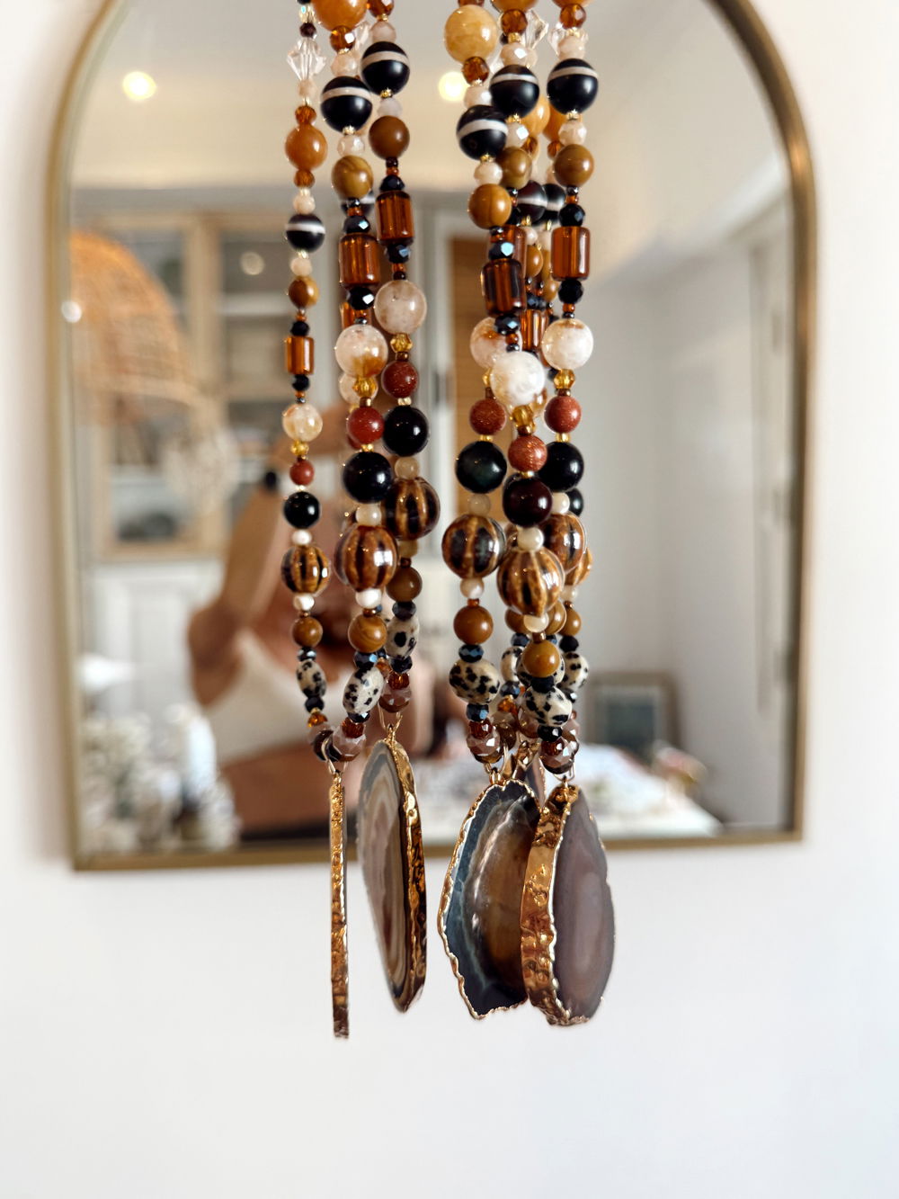 Collar realizado a mano con una combinación de piedras y cristales en tonos tierra, miel y negro que evocan la calidez de la naturaleza.