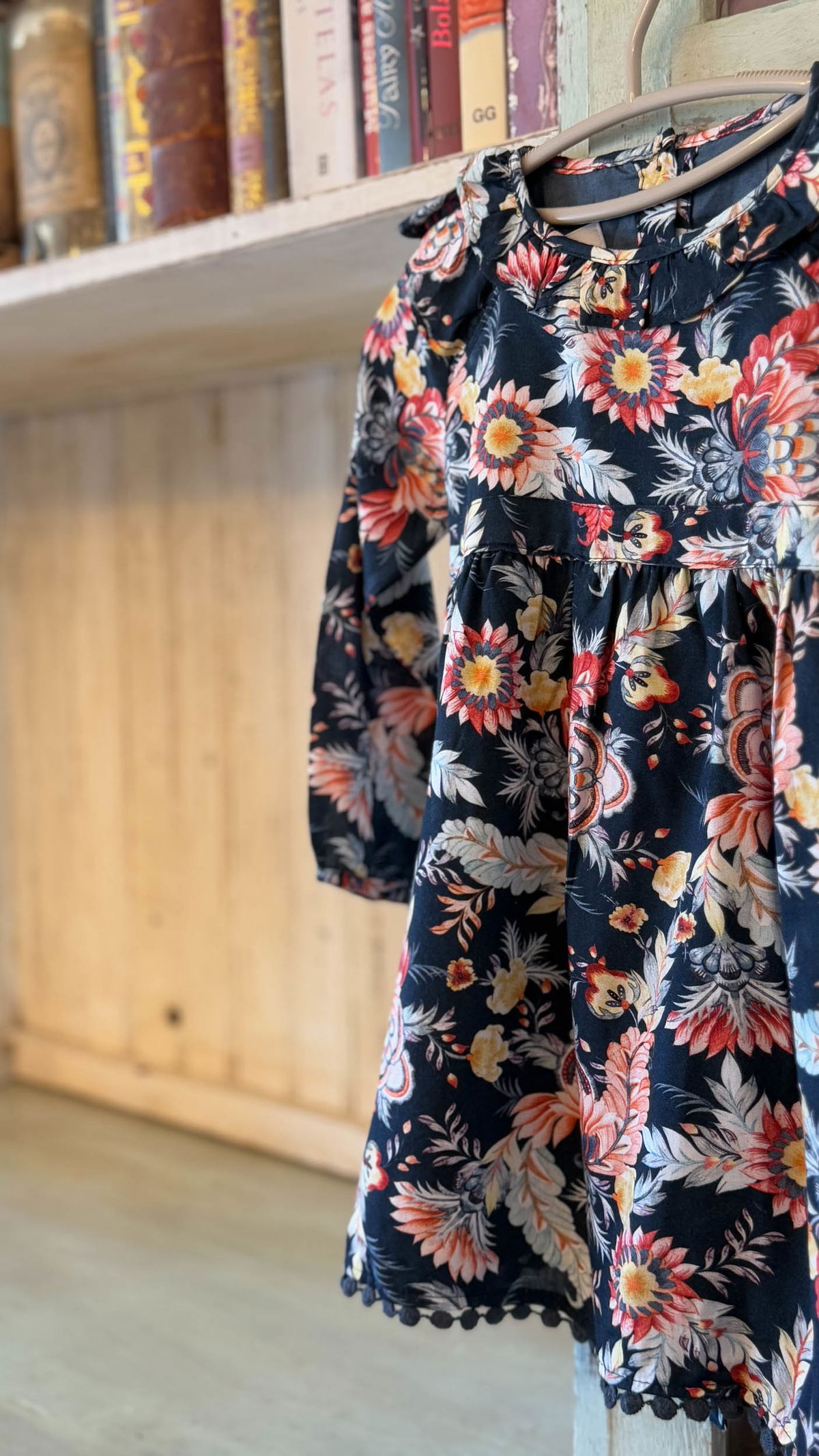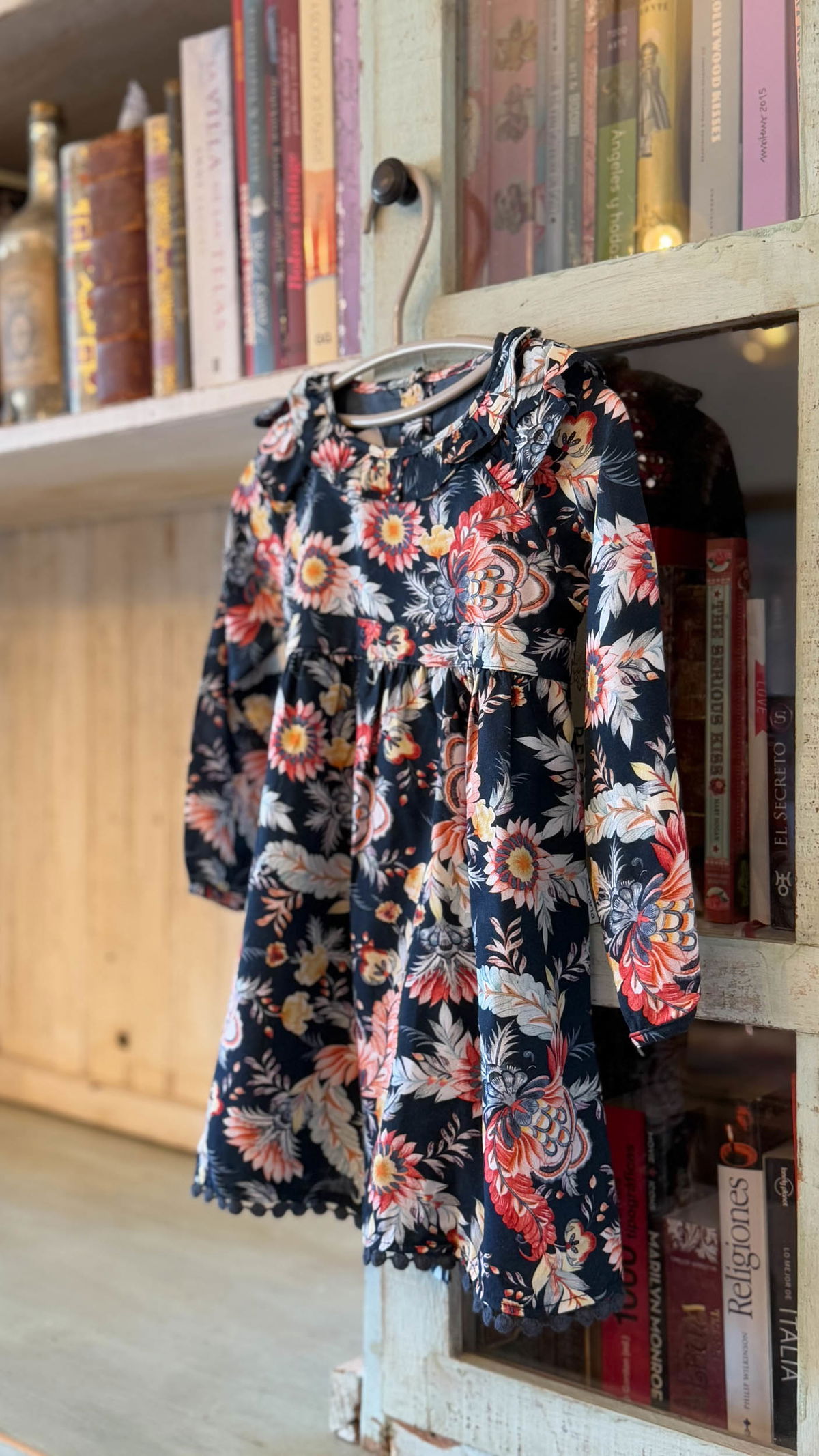 Vestido color azul marino con estampado floral estilizado con elementos paisley y una paleta de colores cálidos de estilo otoñal.