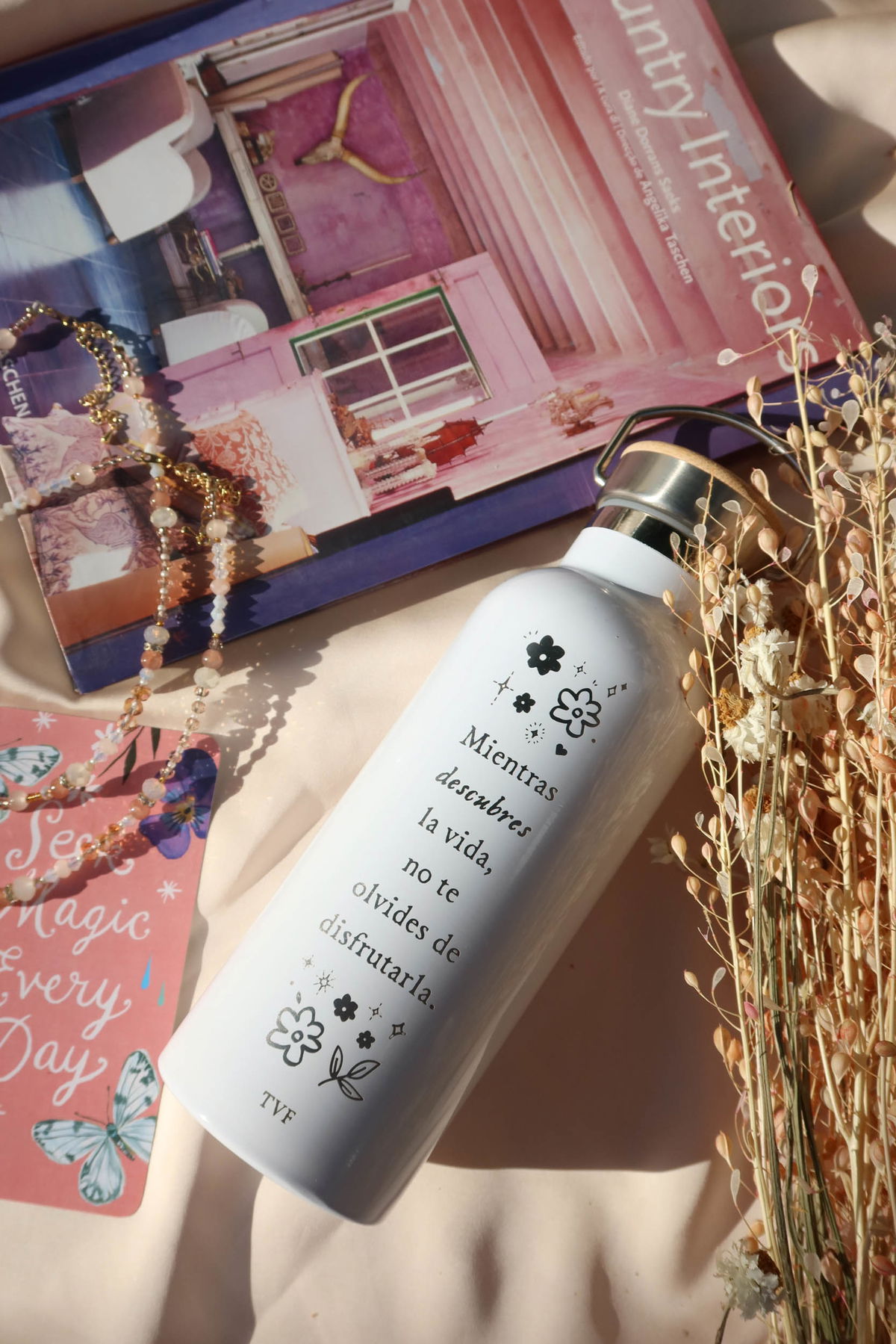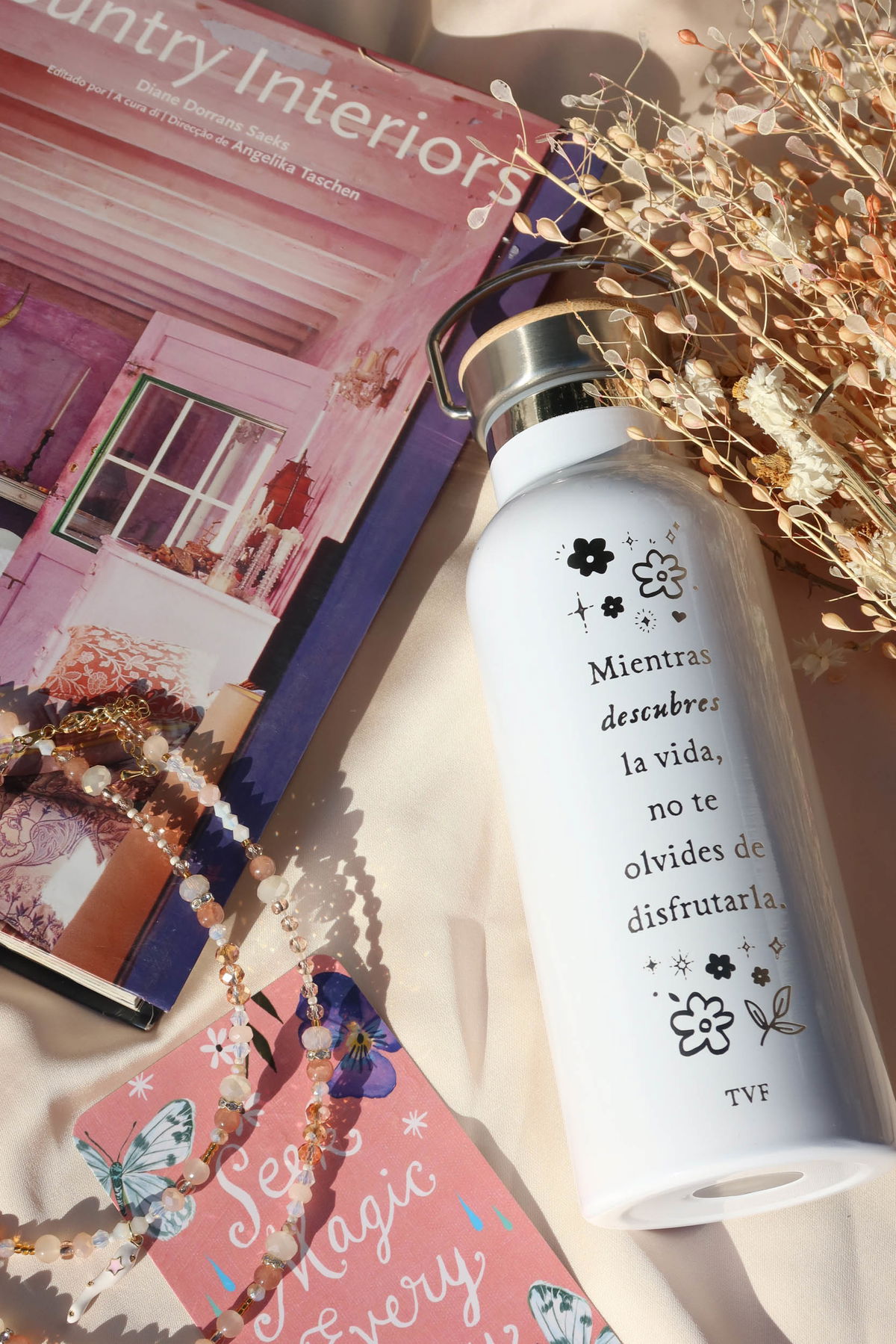 Botella de acero inoxidable blanca, con tapa de bambú y manija para llevar.