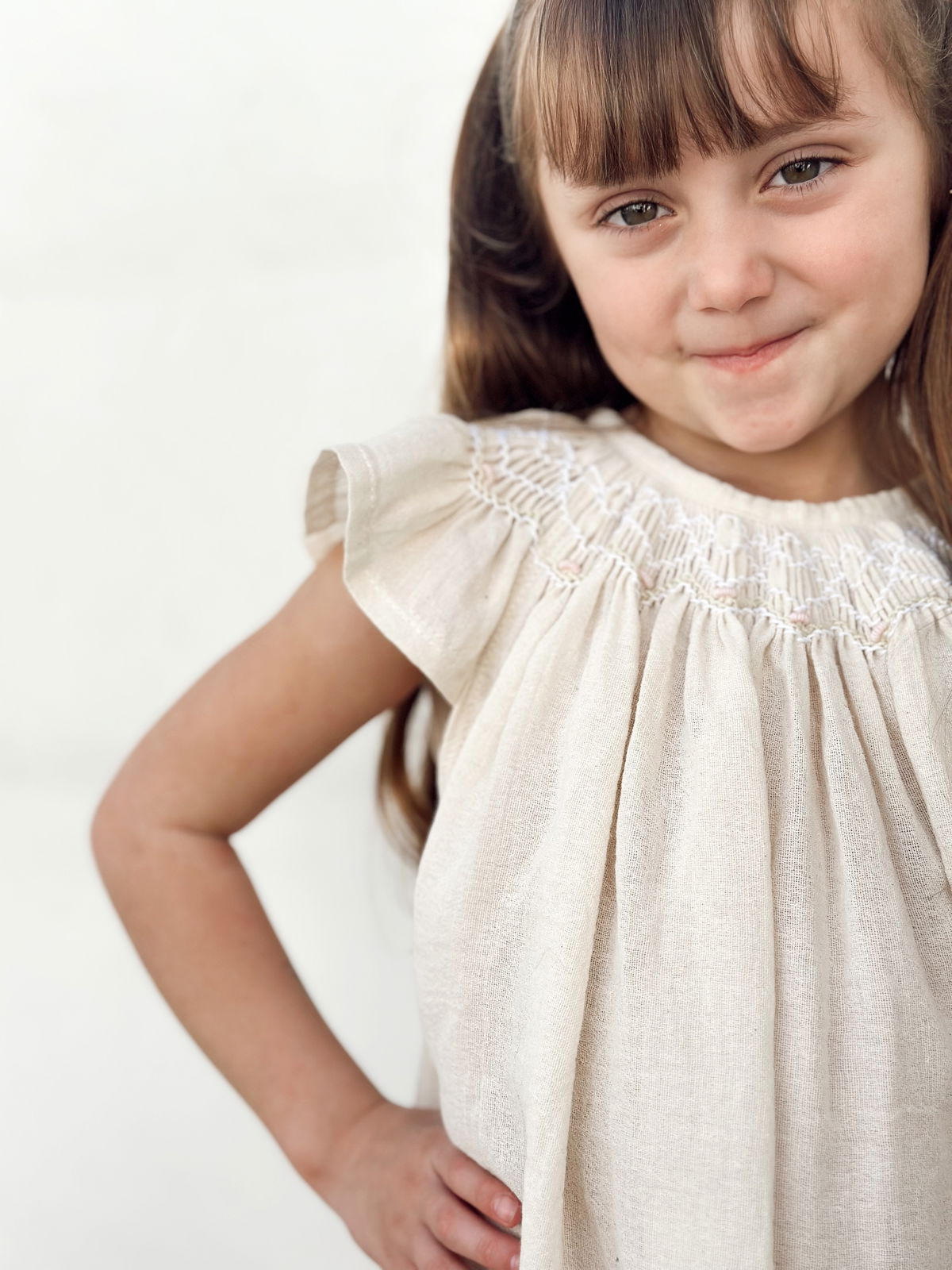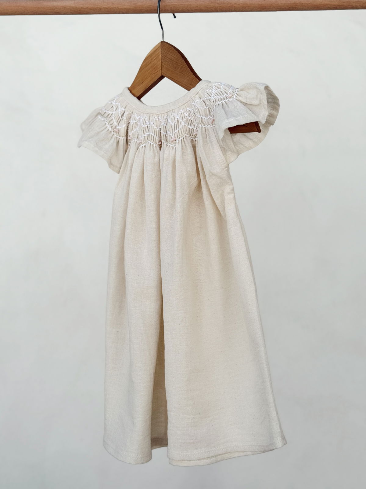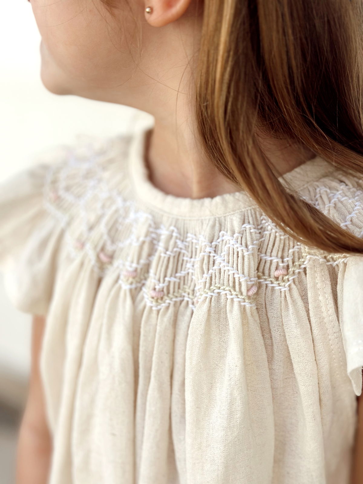 Vestido crudo de gasa de algodón con bordado punto smok.