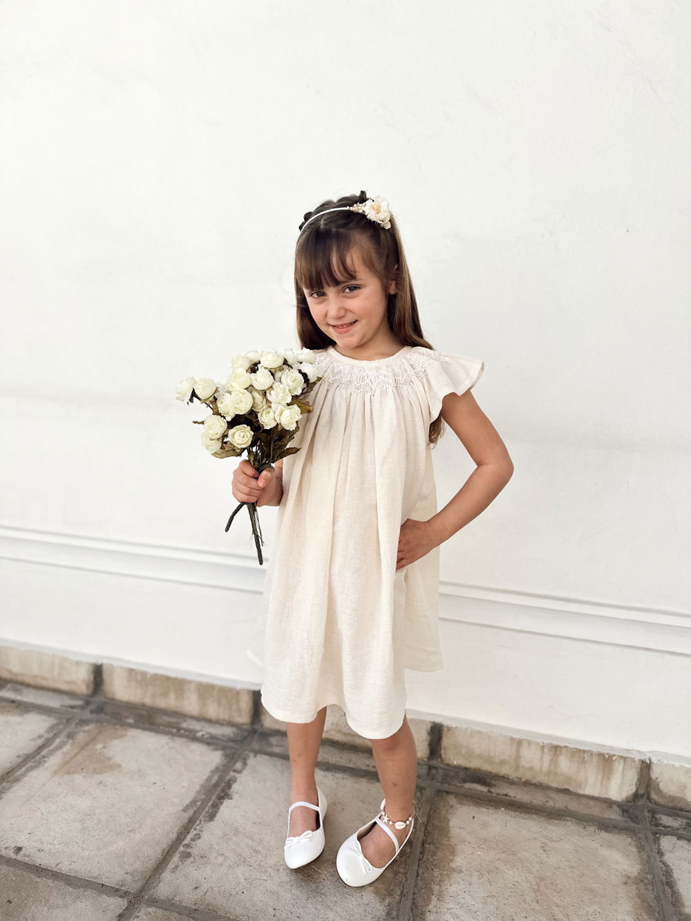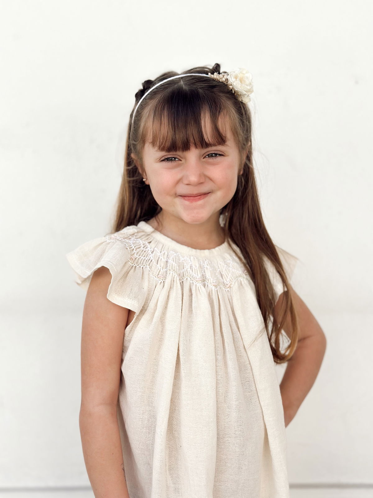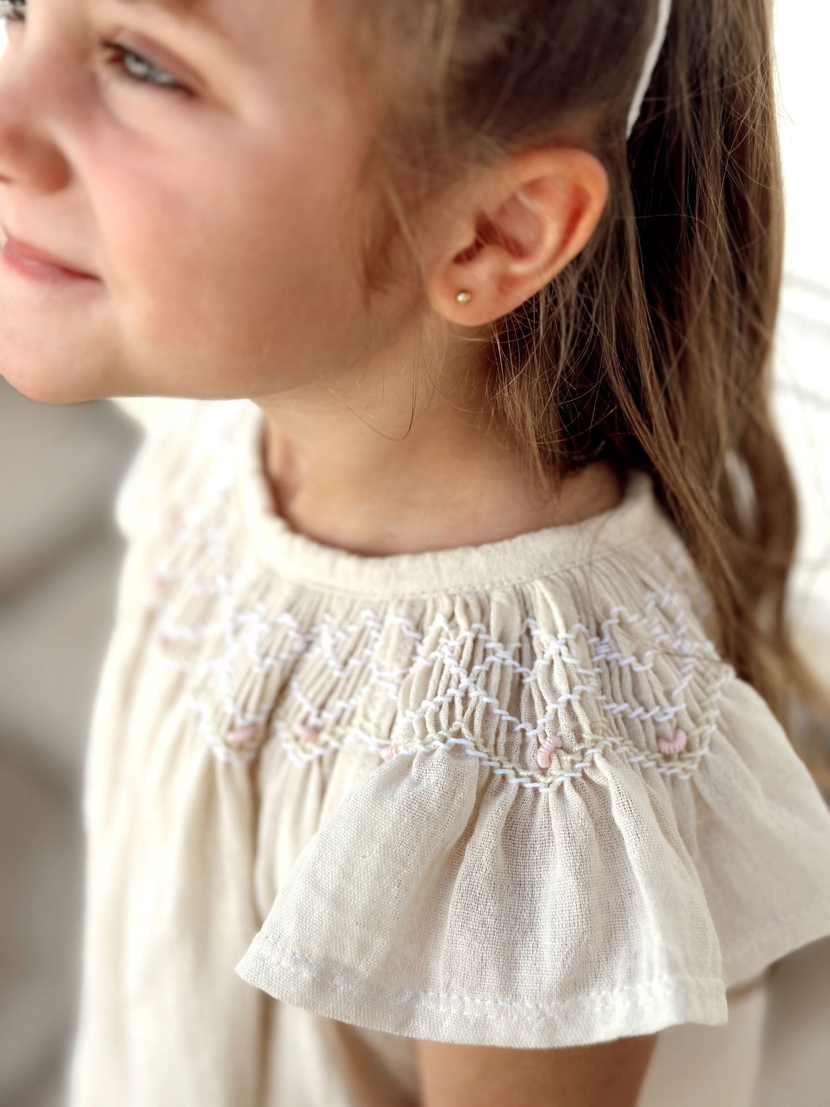 Vestido crudo de gasa de algodón con bordado punto smok.