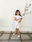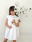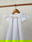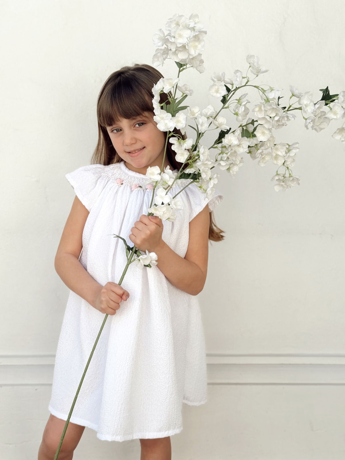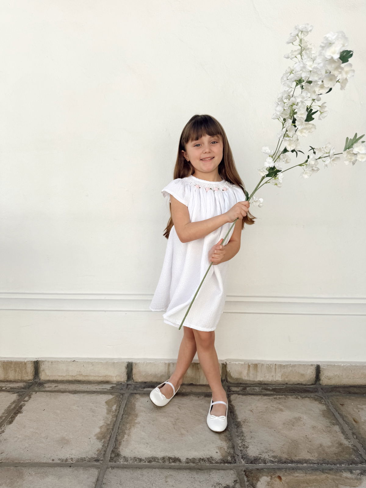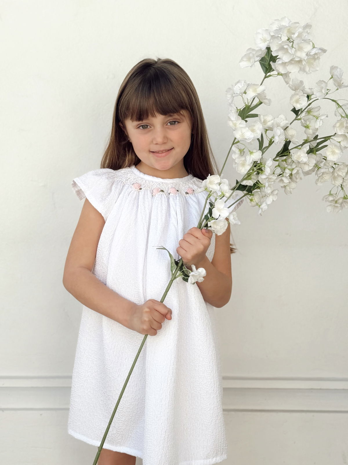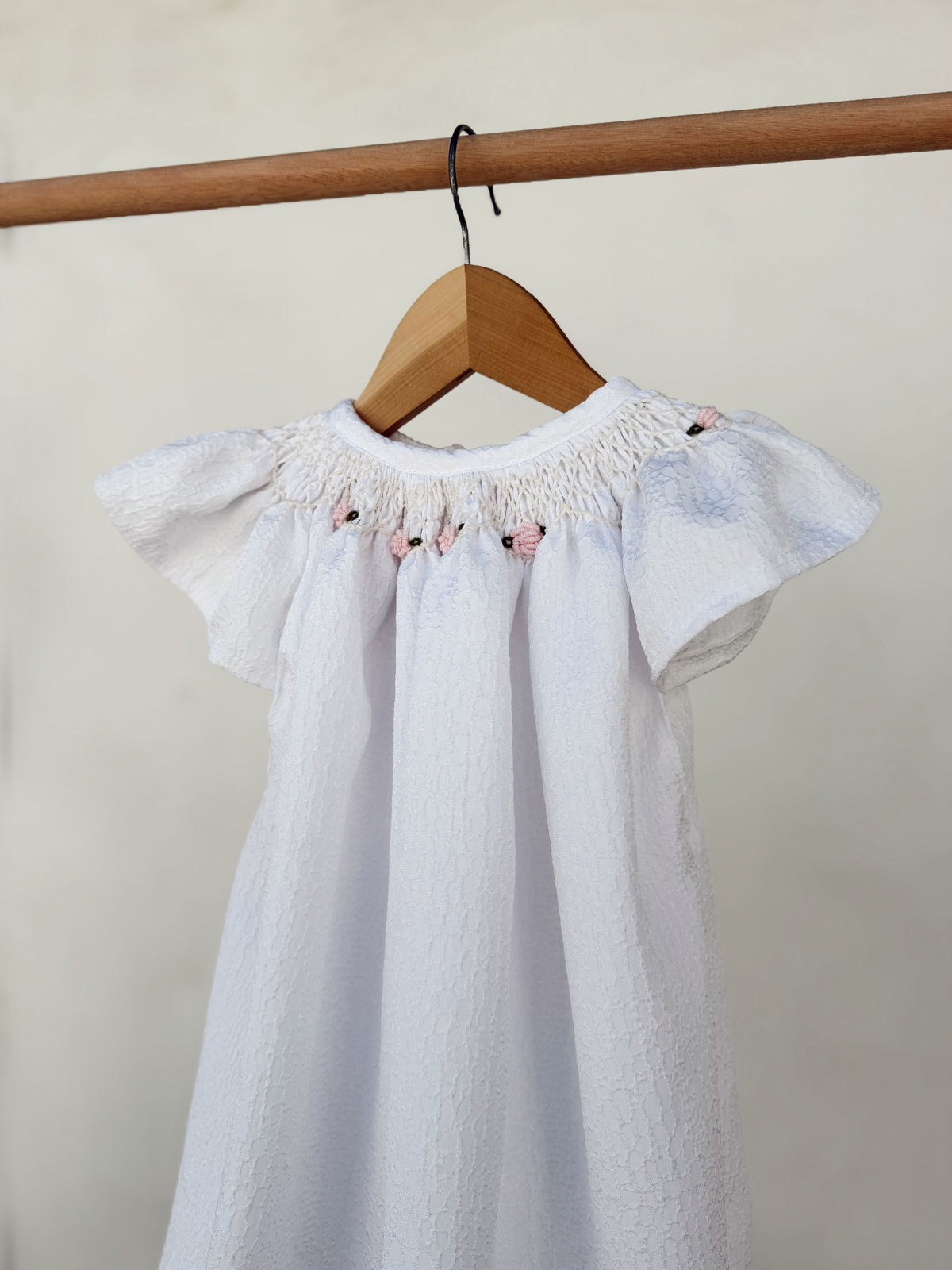 Vestido de bambula labrada con cuello punto smok y flores rosadas.
