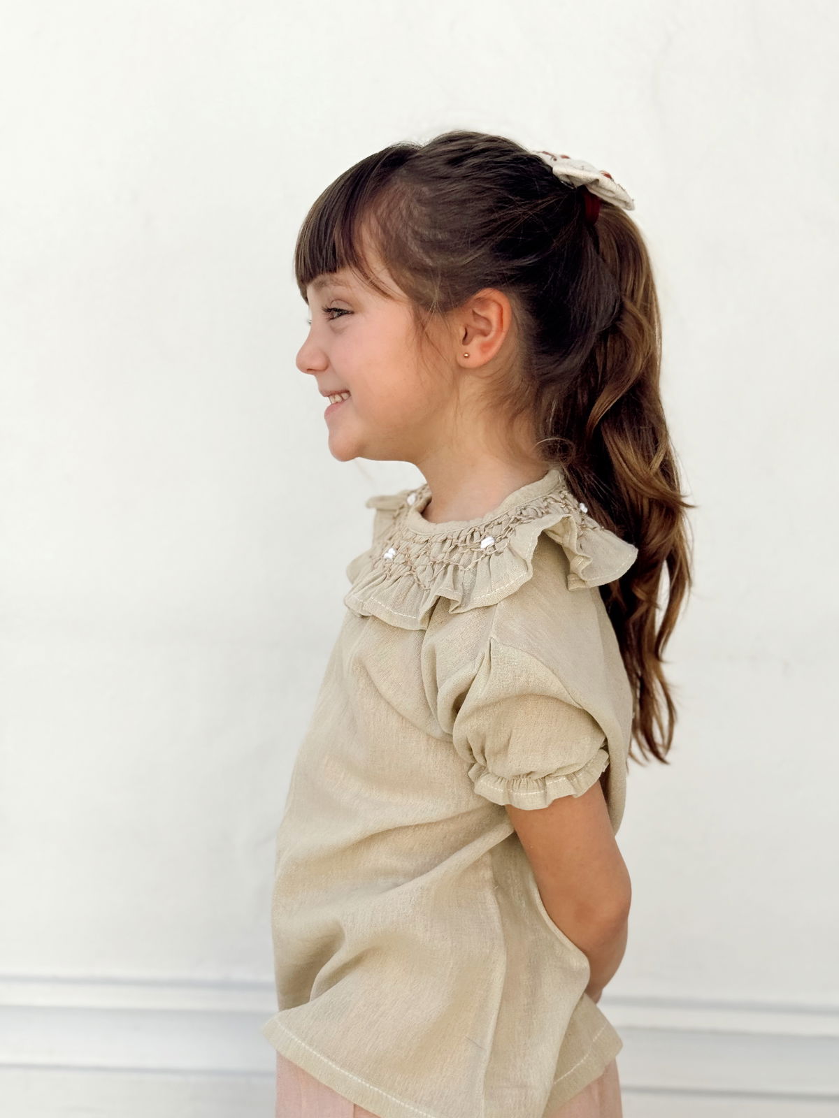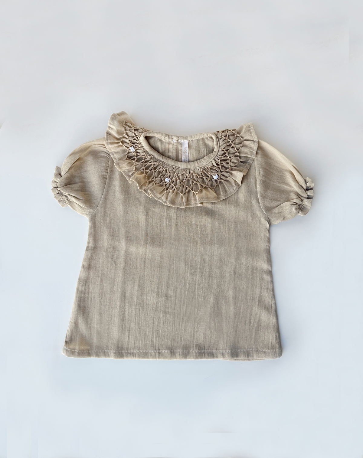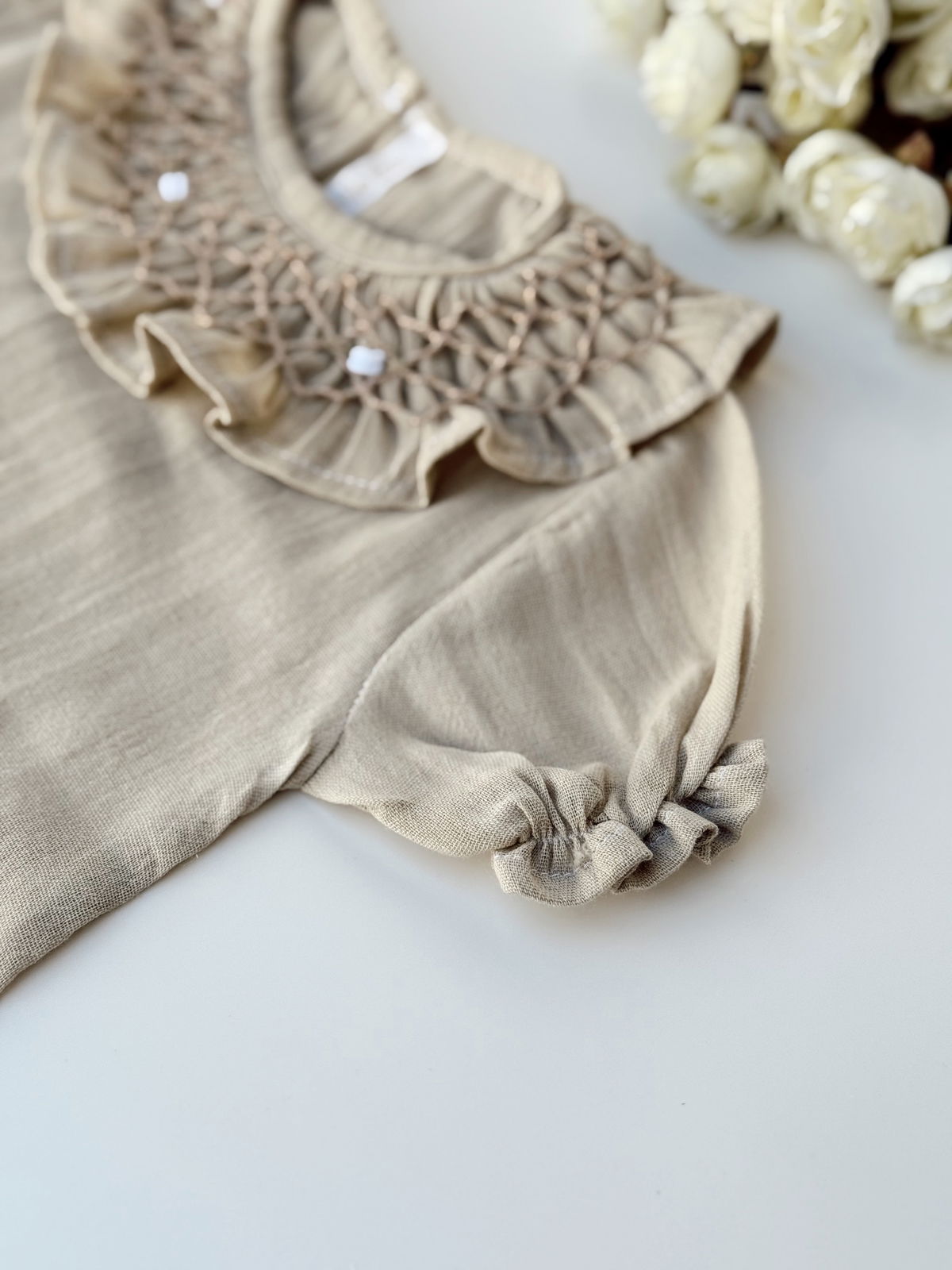 Blusa de gasa de algodón con cuello punto smok y manga fruncida.