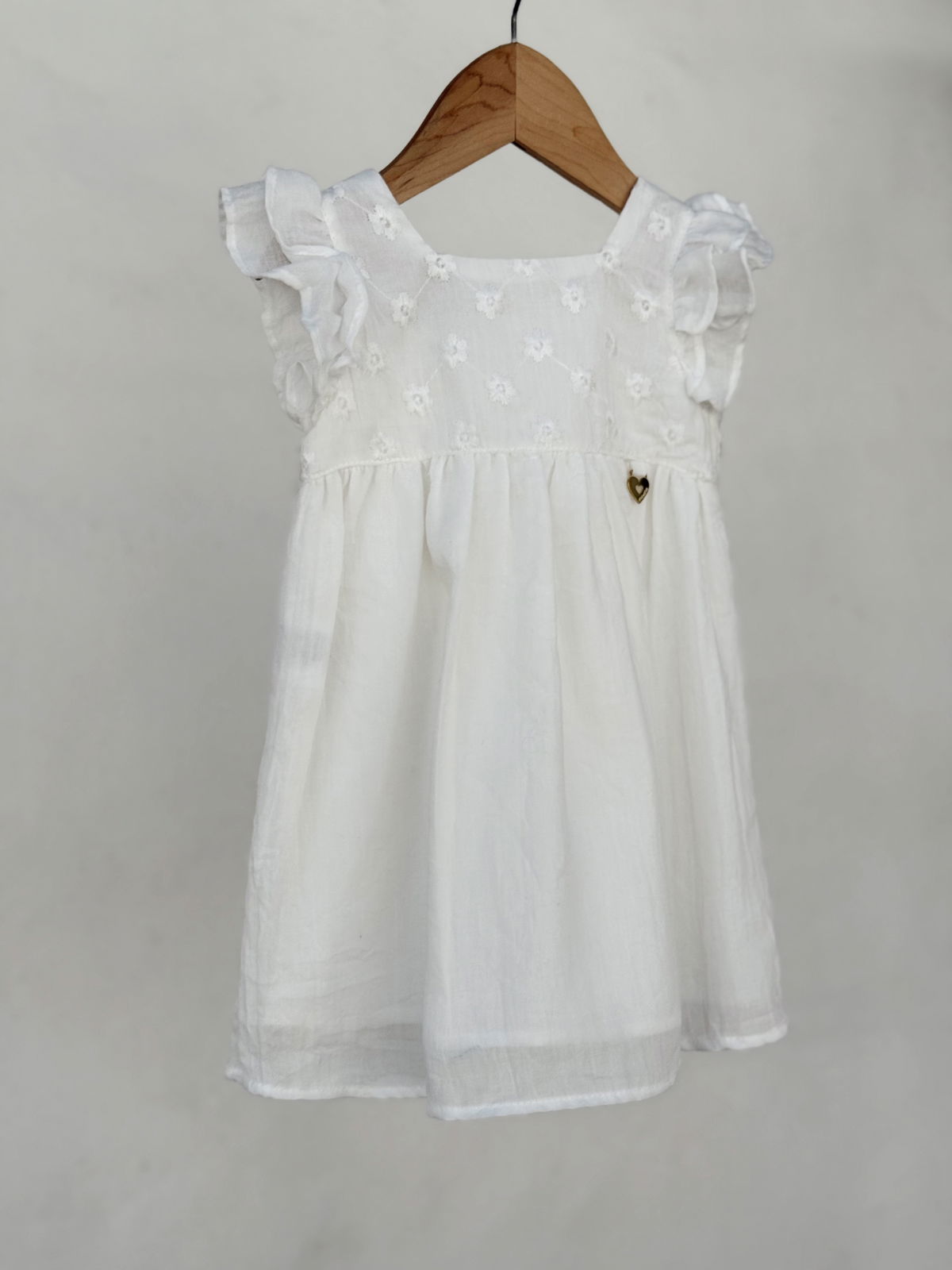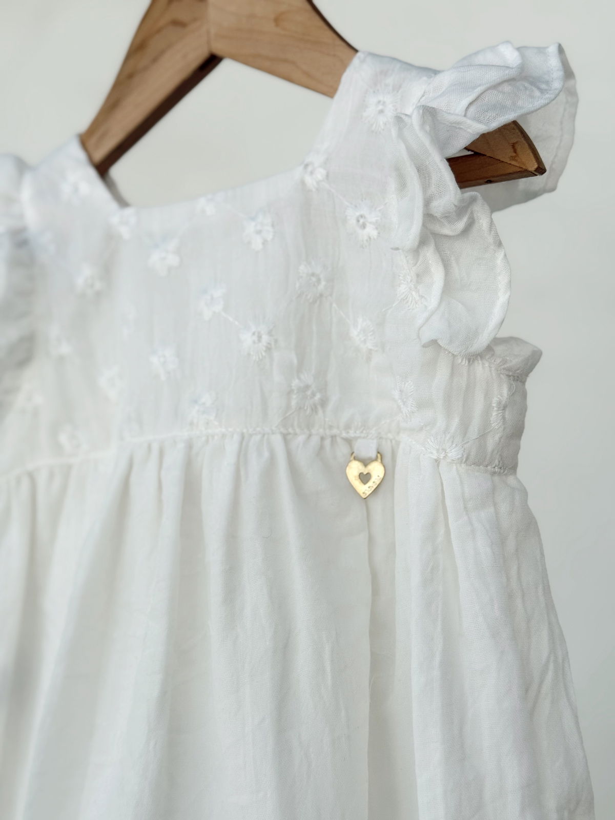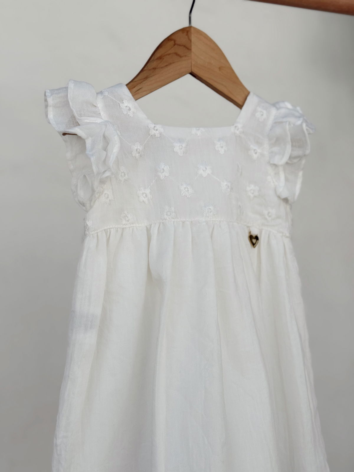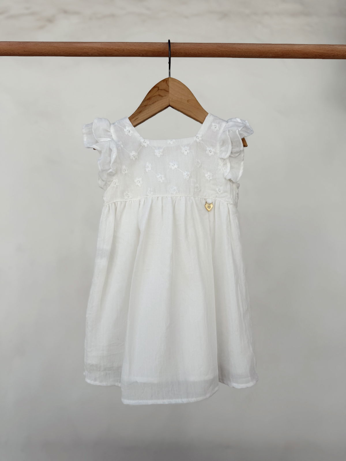 Vestido de gasa con pechera de broderie y manga con vuelos.