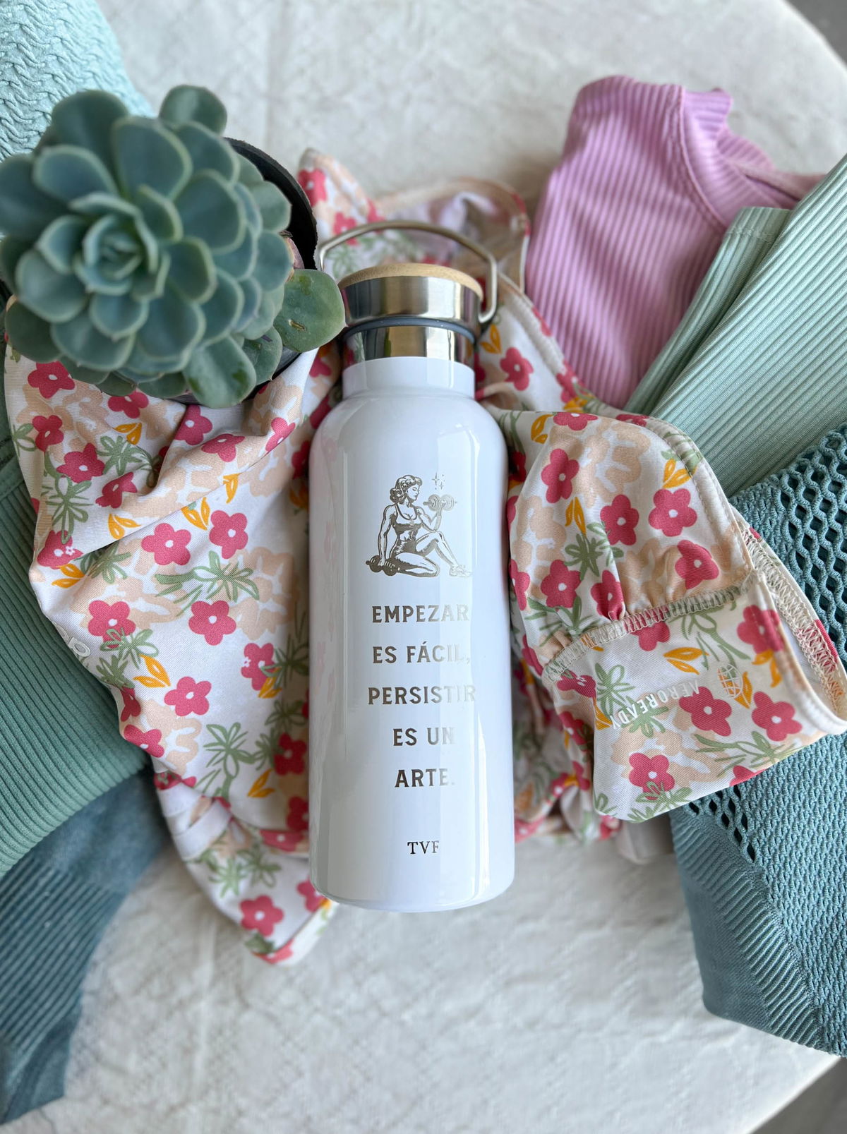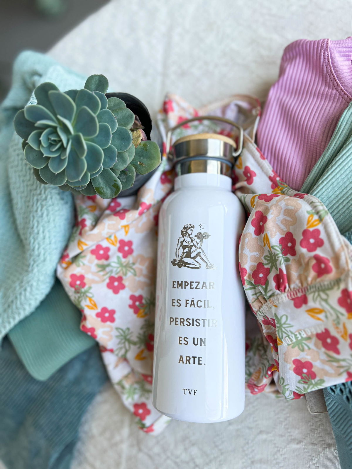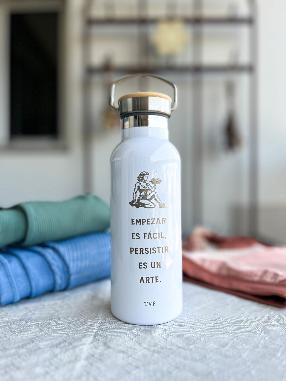 Botella de acero inoxidable blanca, con tapa de bambú y manija para llevar.